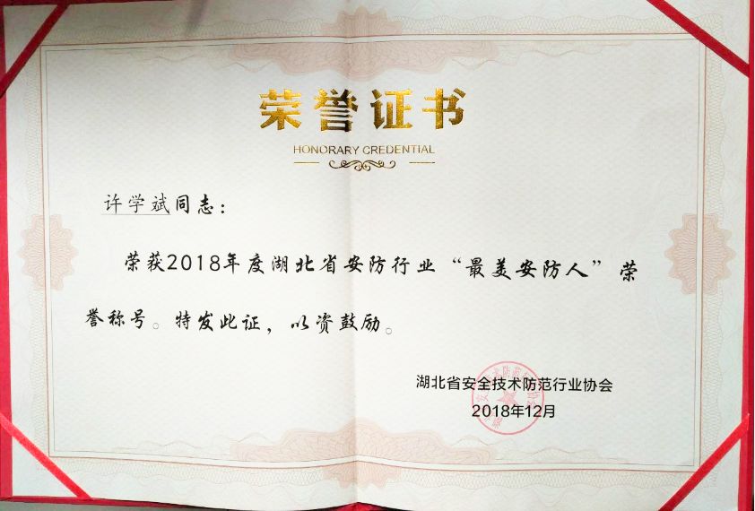 我公司技术岗员工许学斌获得了2018年度湖北省安防行业“最美安防人”的称号,该员工从事安防工作几年以来,工作积极向上,责任心强,爱岗敬业,有强烈的集体荣誉感,积极向上的精神风貌,受到过不少用户单位及行业的认可和好评。