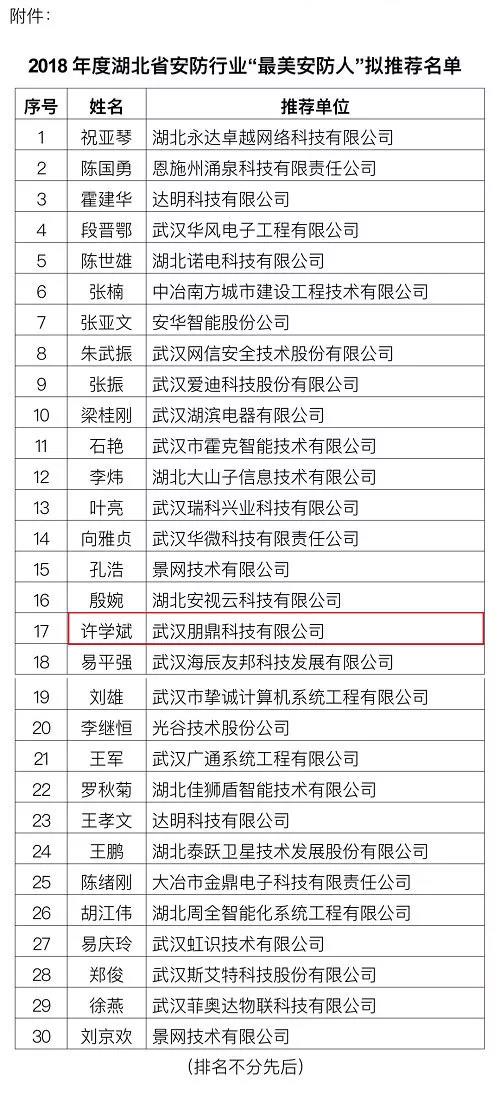 近期,湖北安防协会为深入学习宣传贯彻习近平新时代中国特色社会主义思想和党的十九大精神,联合中国安防展览网开展2018年度湖北省安防行业“最美安防人”评选活动,提升安防人的荣誉感和职业归属感,促进湖北省安防行业持续健康发展。本次活动通过网络投票的方式,评选出30名2018年度湖北省安防行业“最美安防人”。